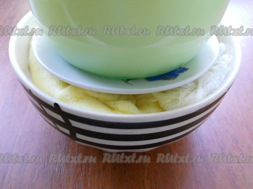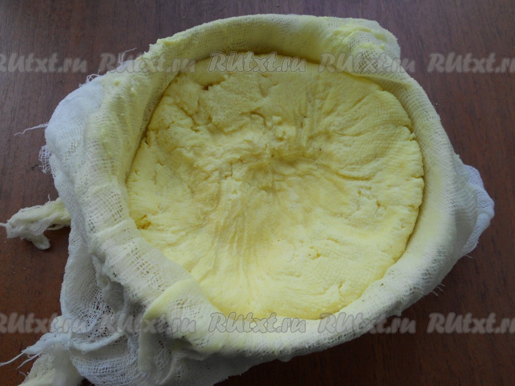 Подвесить марлю с творогом, чтобы лишняя жидкость стекла. Когда творог остынет, отжать его. Поместить творог в марле в подходящую по размеру глубокую посуду.