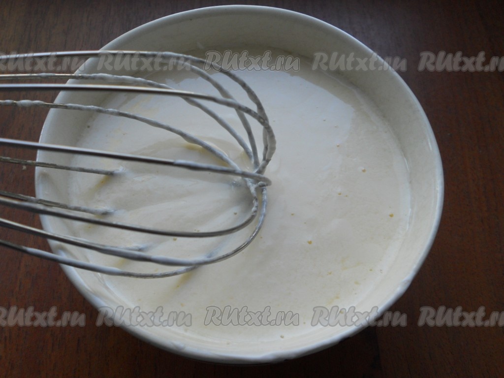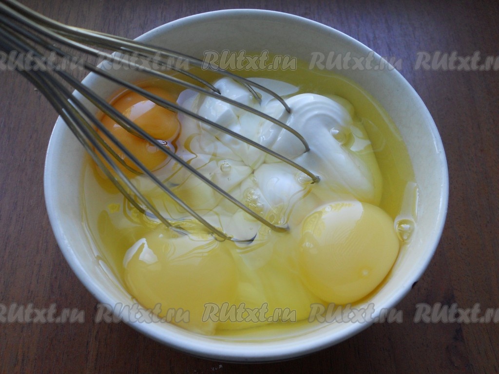 Перемешать яйца со сметаной венчиком до однородного состояния.