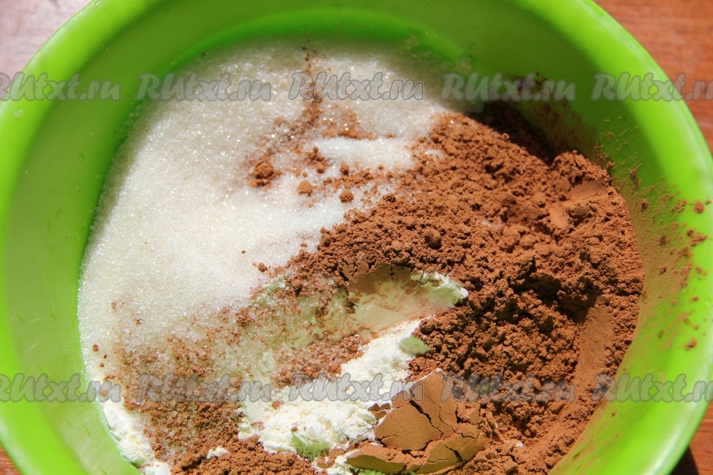Все делается очень просто. В миске соединяем все сухие ингредиенты: сахар, муку, какао, соль, соду и ванильный сахар, слегка перемешиваем.