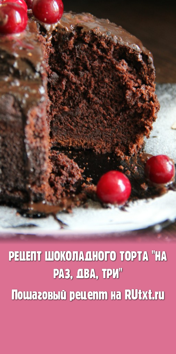 Шоколадный торт "На раз, два, три" - это самый вкусный и легкий в приготовлении тортик, который вам доводилось видеть. Называется он "На раз, два, три" потому, что для его приготовления требуется сделать всего три вещи: смешать сухие ингредиенты, затем добавить к ним жидкие, вылить все в форму и отправить выпекаться. Этот рецепт я очень давно нашла в Интернете, но всё забывала поделиться. Но случилось так, что с этим тортом я победила в одном кулинарном конкурсе. Неожиданно рецепт произвёл фурор. Уверена, потрясающий вкус этого торта понравится и вам. После выпечки торт можно сразу подать к столу, а можно разрезать на коржи, пропитать, смазать любым кремом, переслоить коржи фруктами и так далее. Бисквит сам по себе получается очень влажным и не требует пропитки. Но я, готовя этот торт, всегда пропитываю его разными вариантами пропитки - не для сочности, а, скорее, для дополнительной игры вкуса. Очень люблю пропитку апельсиновым соком, ведь апельсин и шоколад - это очень удачное сочетание. Крем я использую на основе сгущенки и сливочного масла. Вы можете сделать сметанный или заварной крем, в любом случае результат будет великолепным.