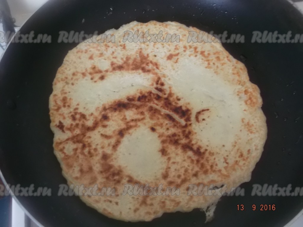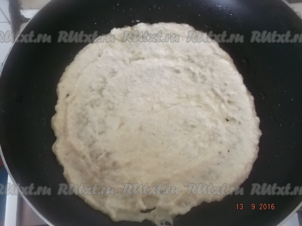 Затем ставим сковороду на средний огонь, разогреваем, наливаем совсем немного масла, только чтобы смочить сковороду, и ложкой выкладываем тесто, размазывая по кругу, чтобы получился блин толщиной примерно 0,5 см.