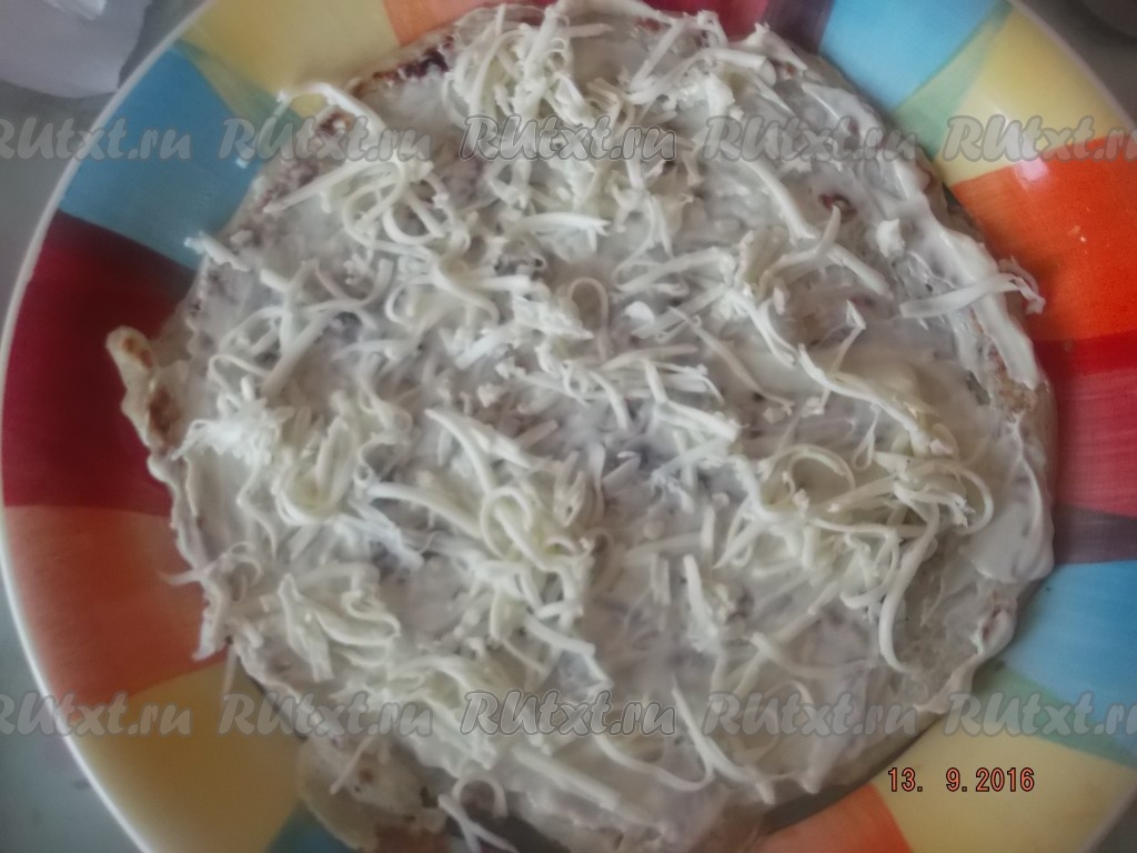 Потом посыпаем натертым на средней терке плавленным сырком (сырок можно поместить на 30 минут в морозилку, чтобы он лучше натирался).