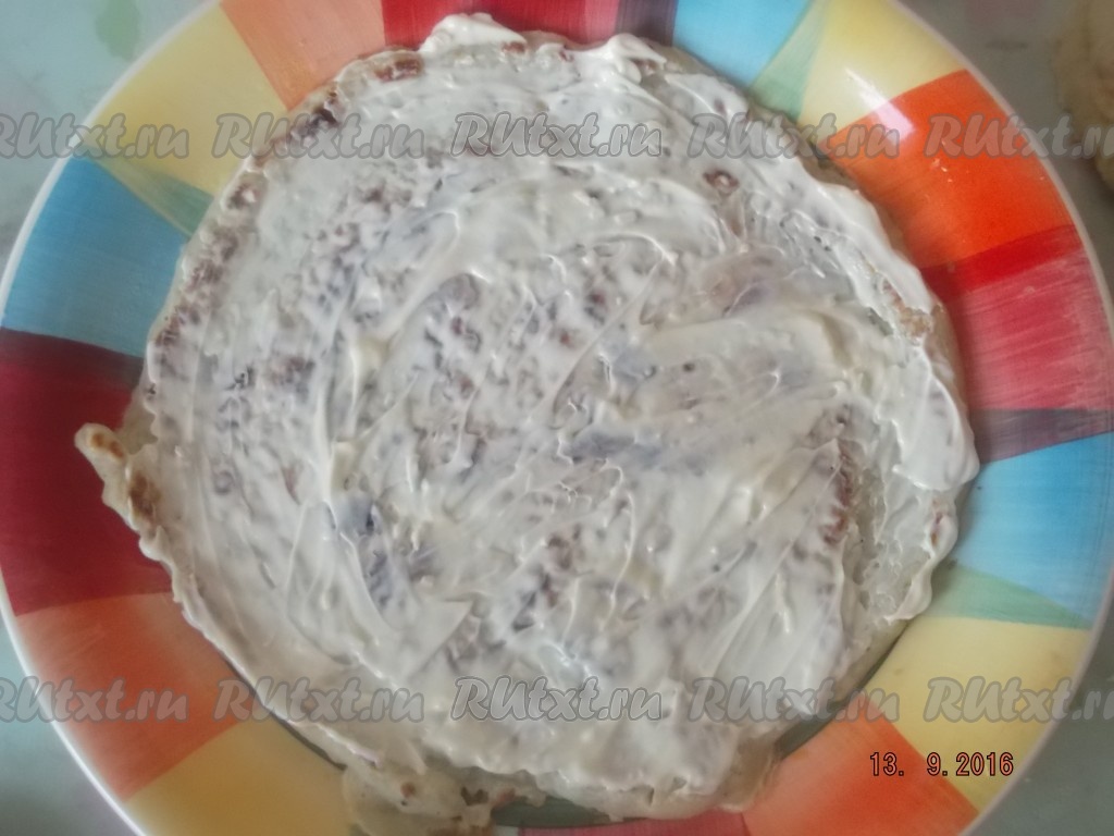 В отдельной мисочке смешиваем майонез и пропущенный через пресс чеснок. Когда коржи остынут, можно приступать к формированию тортика. На поднос или блюдо с ровным дном выкладываем первый корж, смазываем его смесью майонеза и чеснока.