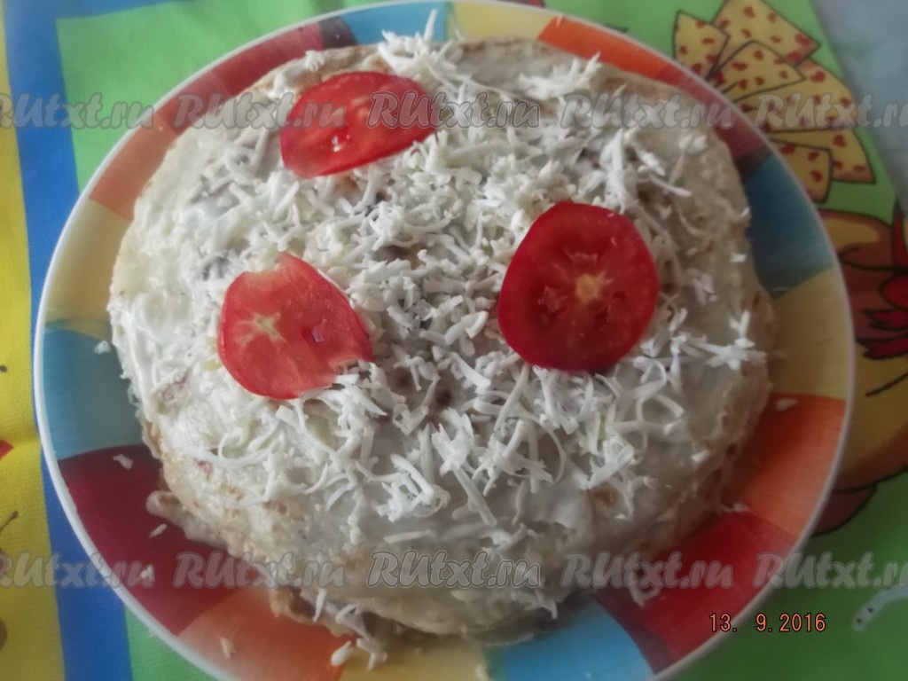 Затем чередуем слои: выкладываем следующий кабачковый корж, смазываем его майонезом с чесноком, посыпаем плавленным сыром, раскладываем дольки помидоров, кладём следующий корж и так далее. Верхний корж смазываем смесью майонеза и чеснока, посыпаем сыром, украшаем помидорами, можно посыпать натёртым вареным яйцом.