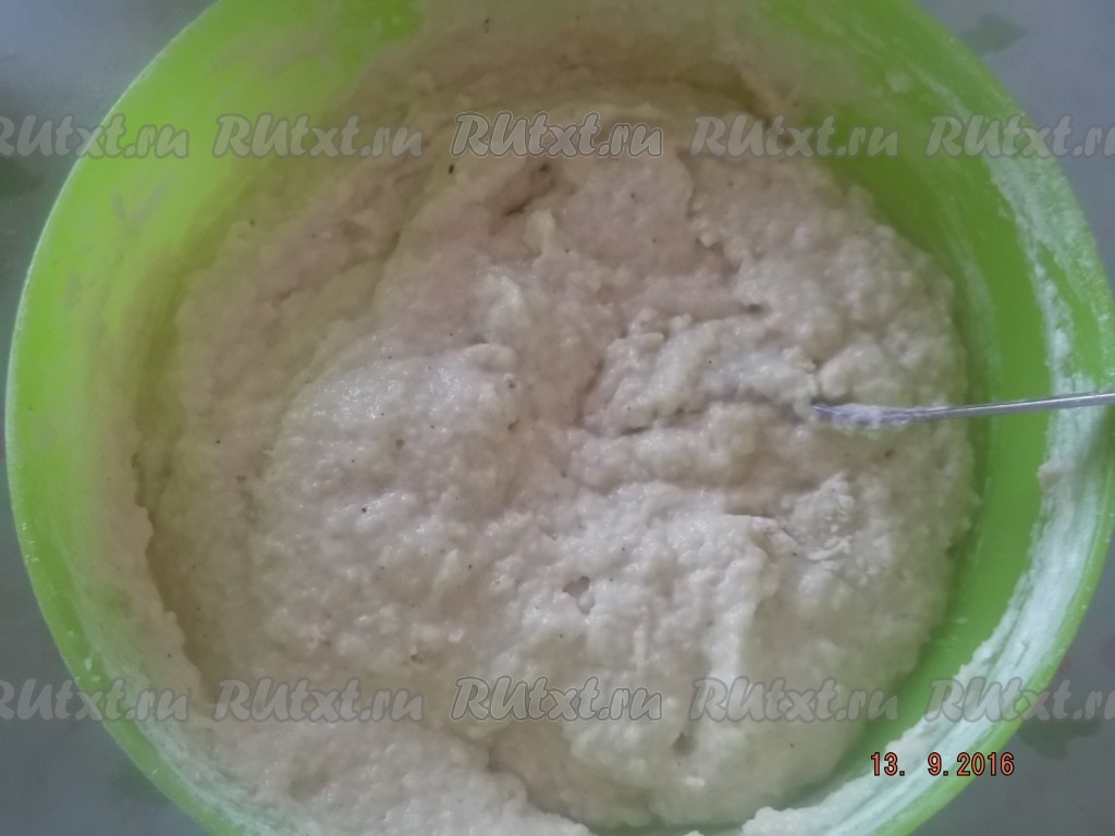 Начинаем добавлять муку, постепенно замешивая тесто до консистенции густой сметаны, чтобы оно накладывалось на ложку.