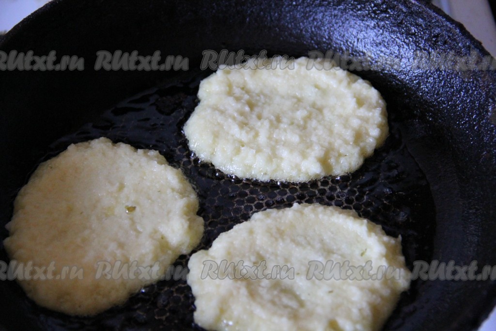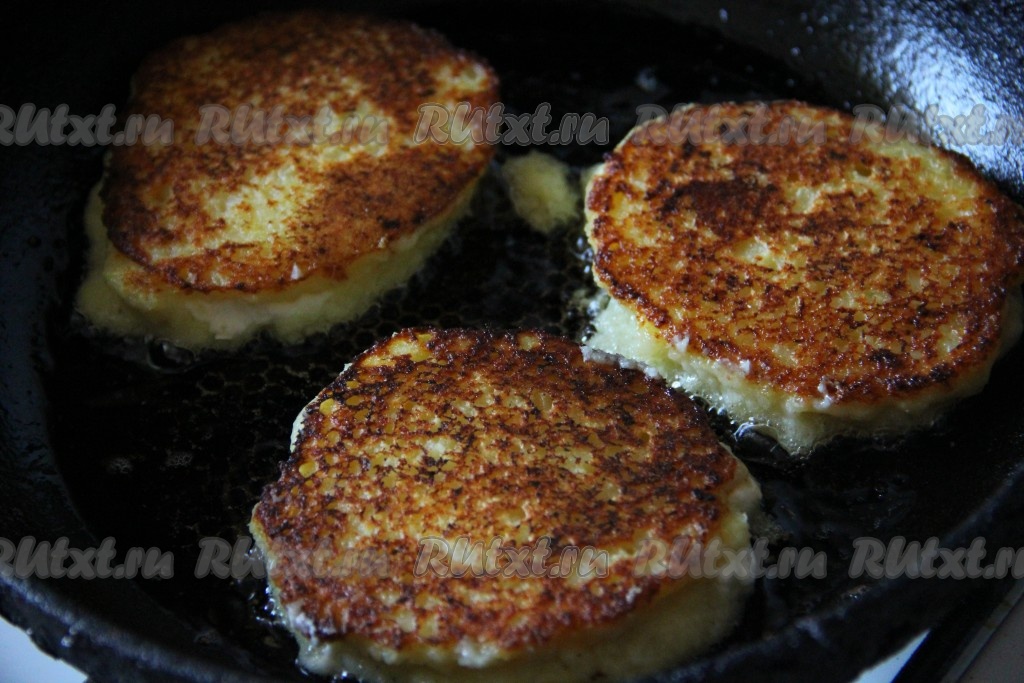 Жарить драники с творогом на небольшом огне с двух сторон до золотистой корочки.