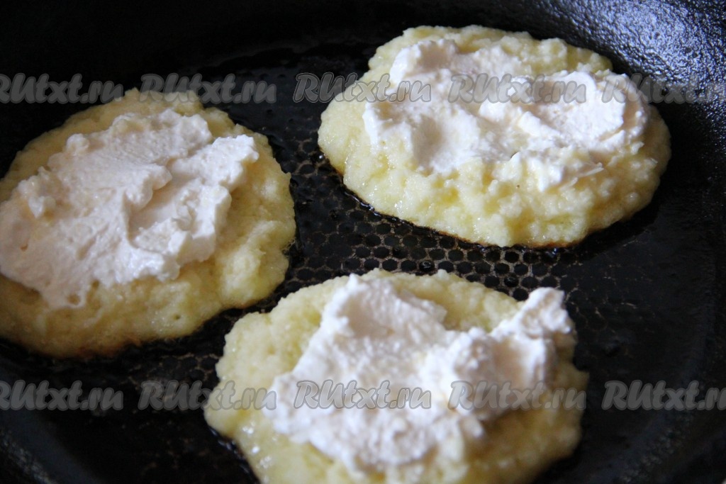 Сверху на картофельный оладушек выложить творог, равномерно распределяя его.