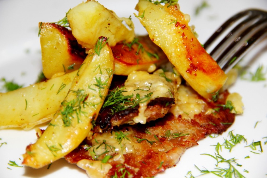 Мягкие, сочные кусочки мяса вместе с нежной, аппетитной картошкой, запечённые в майонезе с сыром в духовке, к столу подаём горячими, дополнив, маринованными или свежими овощами.