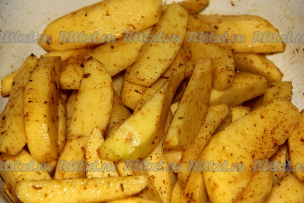 Картофель очищаем от кожуры, нарезаем на небольшие дольки, вливаем 1 столовую ложку растительного масла, солим, посыпаем специями (я использовала специи для картофеля), перемешиваем.