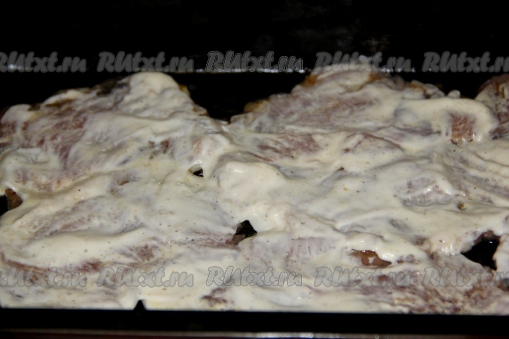 Противень смазываем растительным маслом (или застилаем пергаментом), выкладываем отбитые кусочки мяса в один слой. Смазываем мясо сверху майонезом.