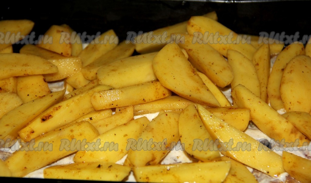 Поверх мяса равномерно выкладываем дольки картофеля.