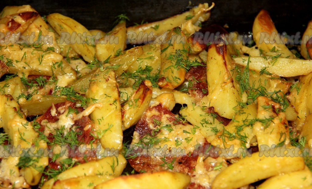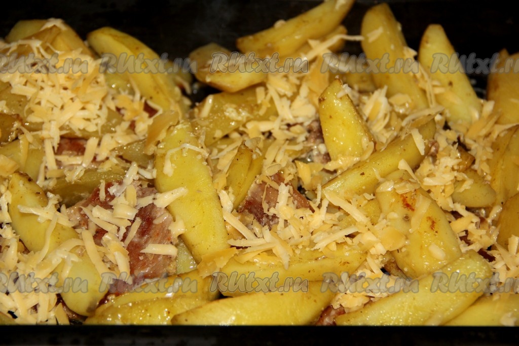 Ставим противень в духовку, прогретую до 180 градусов. Запекаем картошку с мясом в майонезе 60 минут (картофель должен стать достаточно мягким, легко прокалываться ножом). Затем достаём противень, посыпаем картошку сыром, натёртым на крупной тёрке.