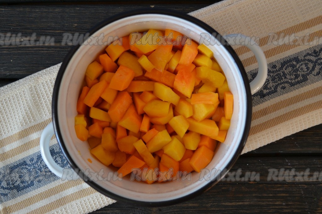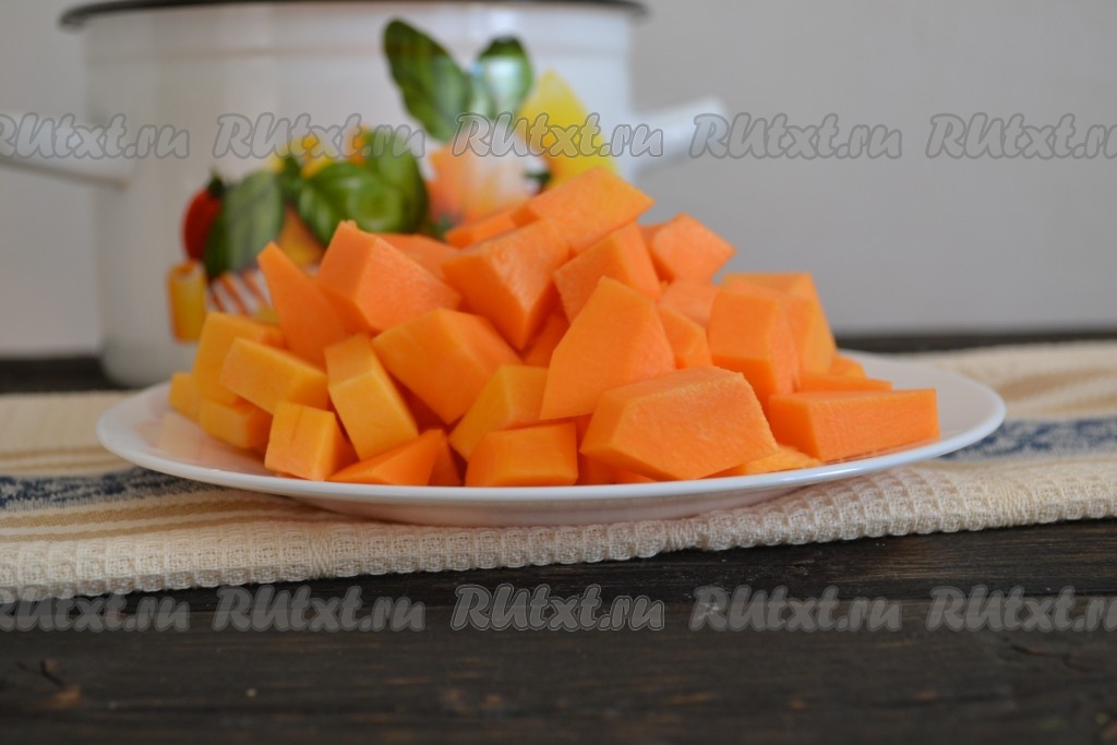 Тыкву очистить от кожицы и семян, нарезать мелкими кубиками.