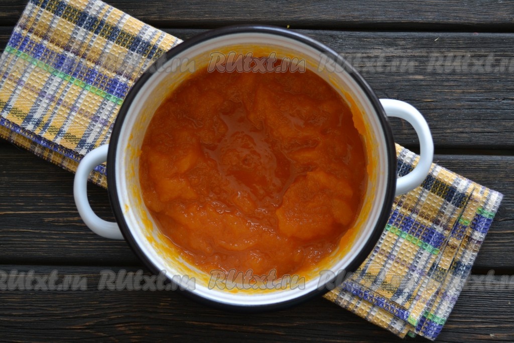 Поставить кастрюлю с тыквой на слабый огонь и уваривать тыкву до густого пюреобразного состояния. Это займет 1-1,5 часа. Вначале варенье часто перемешивать не нужно - в кастрюле будет достаточно много жидкости, поэтому ничего не подгорит и не убежит. А вот во второй половине приготовления, отходить далеко от плиты не стоит - помешивать придется, практически, непрерывно.
