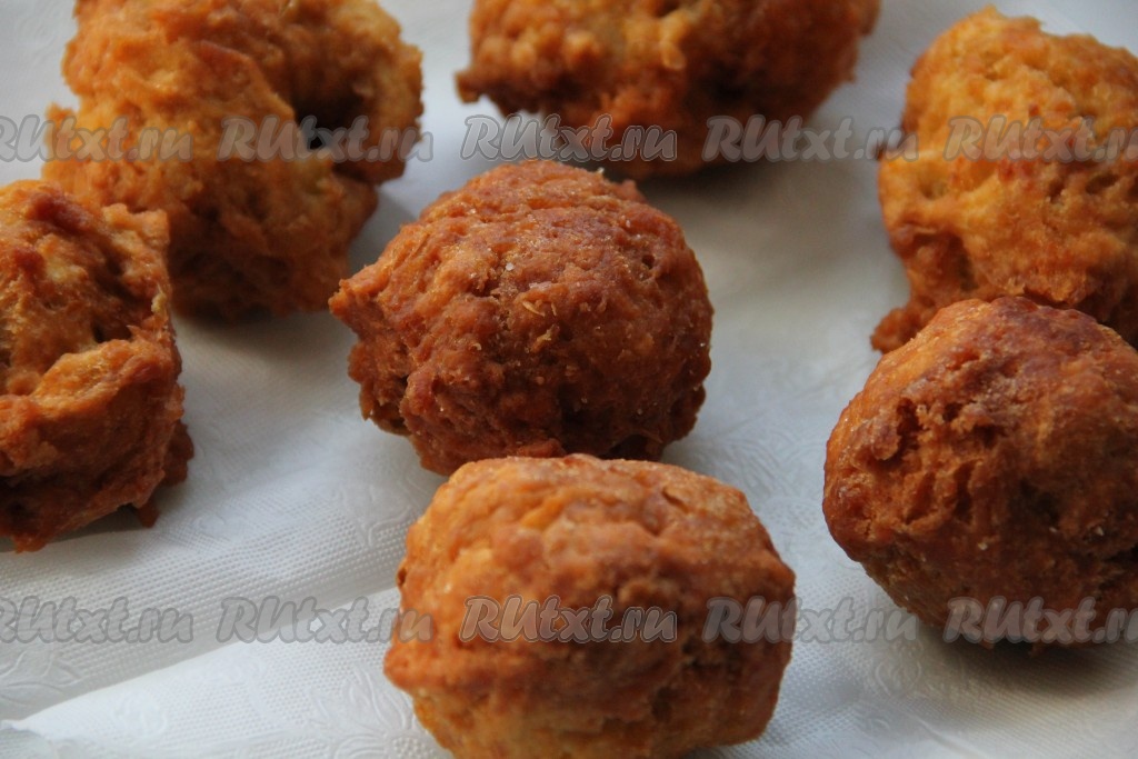 Готовые яблочные пончики достаём из фритюра и выкладываем на бумажную салфетку, чтобы убрать лишнее масло.