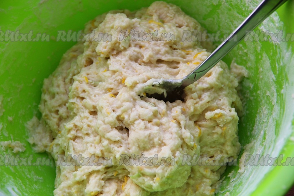 Вливаем в миску молоко, всыпаем сахар, разрыхлитель и половину муки. Перемешиваем тесто до однородности и начинаем понемногу досыпать оставшуюся муку, замешивая тесто столовой ложкой. Всыпая муку, учитывайте, что тесто должно получиться достаточно густым и вязким, как на фото. Тесто должно не растекаться, а лежать на ложке. Как только добились требуемой консистенции, больше муку не добавляйте.