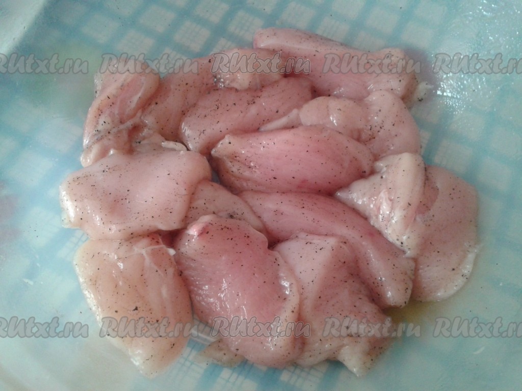 Куриное филе вымыть, нарезать продольными кусочками, посолить, поперчить.