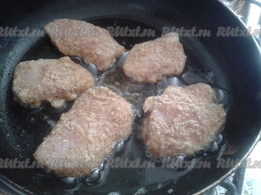 Каждый кусочек куриного мяса нужно обвалять в муке, затем окунуть в кляр (старайтесь, чтобы с наггетсов кляр не стекал, иначе не удобно будет обваливать в сухарях, я каждый кусочек обтираю об край тарелки с кляром). Затем мясо в кляре обваливаем в панировочных сухарях и выкладываем на сковороду с разогретым растительным маслом.