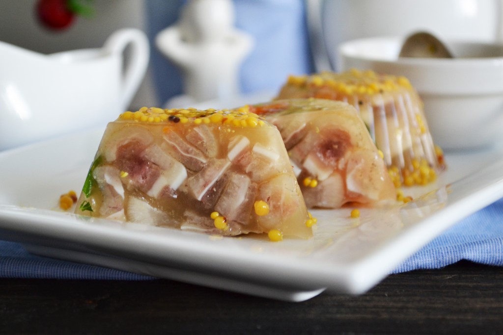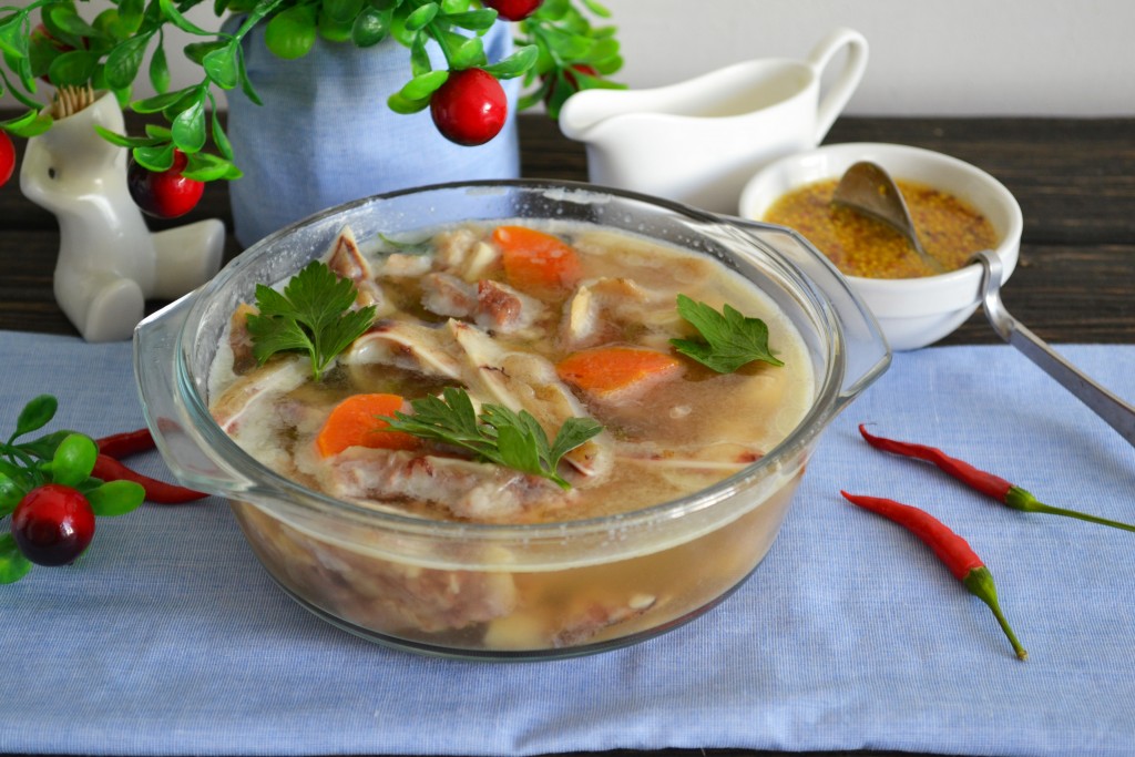 Вкуснейший, похрустывающий холодец из свиных ушей готов. Подать на стол с горчицей.