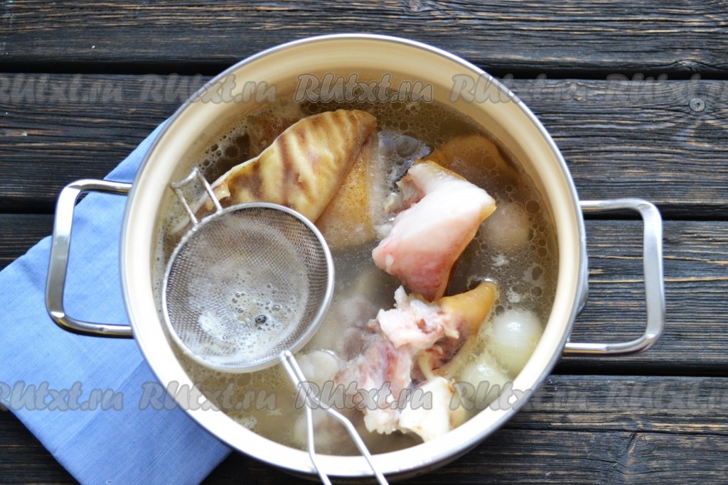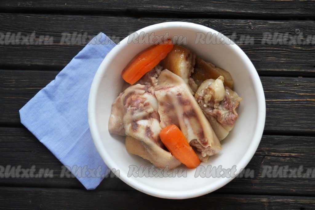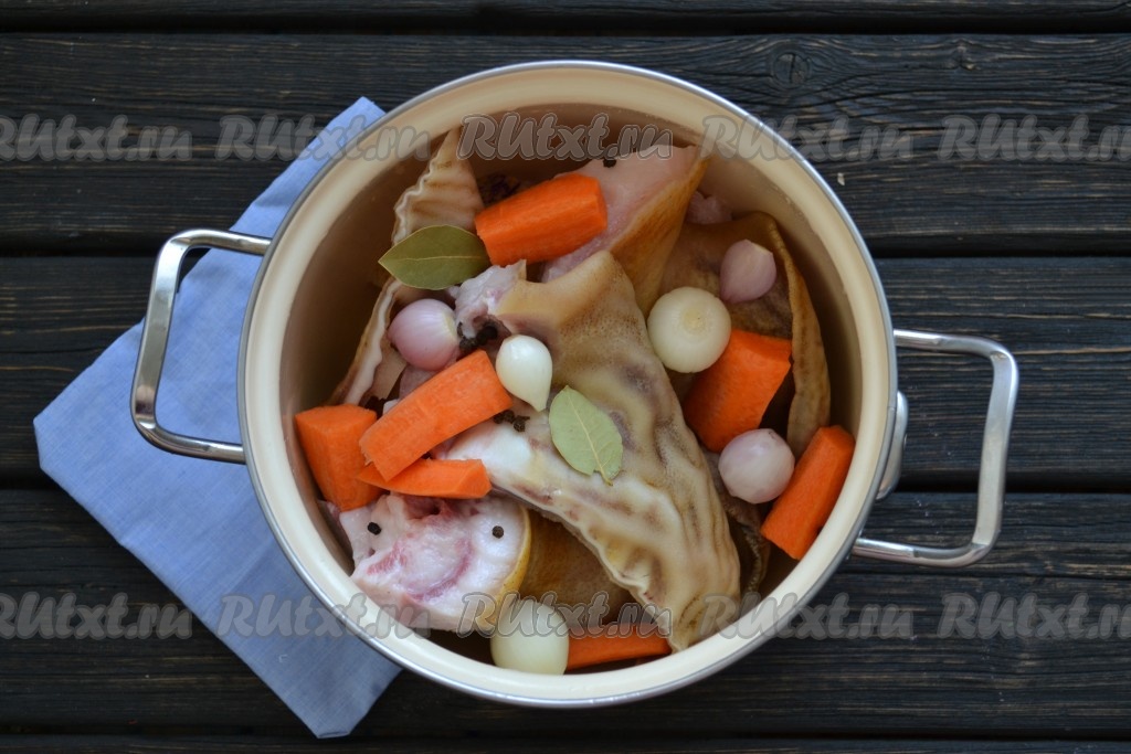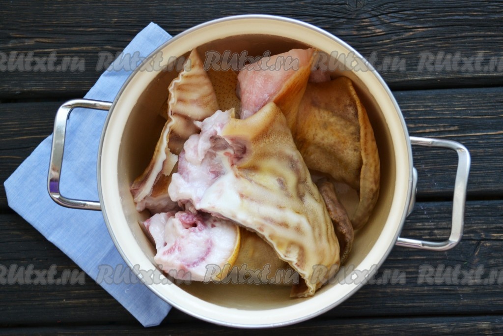 Свиные уши тщательно вымыть, разрезать на 2-3 части, вымыть и вычистить еще раз, особенно в труднодоступных местах. Обдать кипятком и выложить в кастрюлю, в которой будете варить холодец.