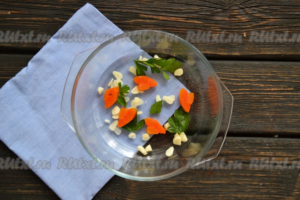 По мисочкам разложить мелко нарезанный чеснок и небольшие кусочки сваренной моркови. По желанию выложить по несколько листиков петрушки.