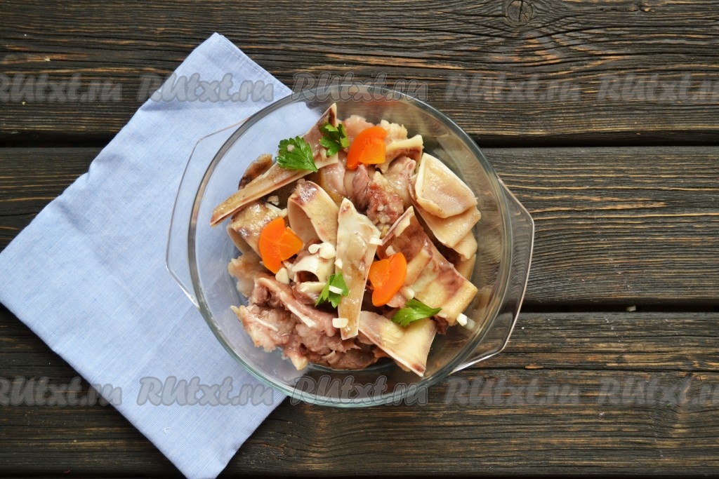 Мясо с нежными хрящиками нарезать небольшими кусочками и разложить по формам.