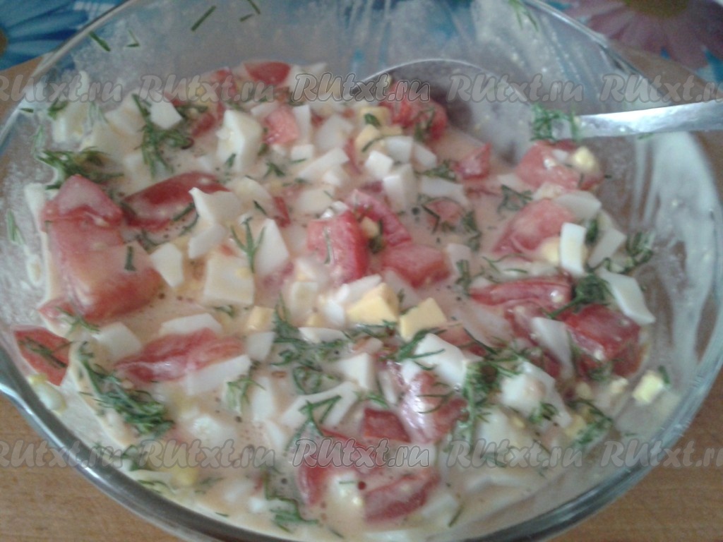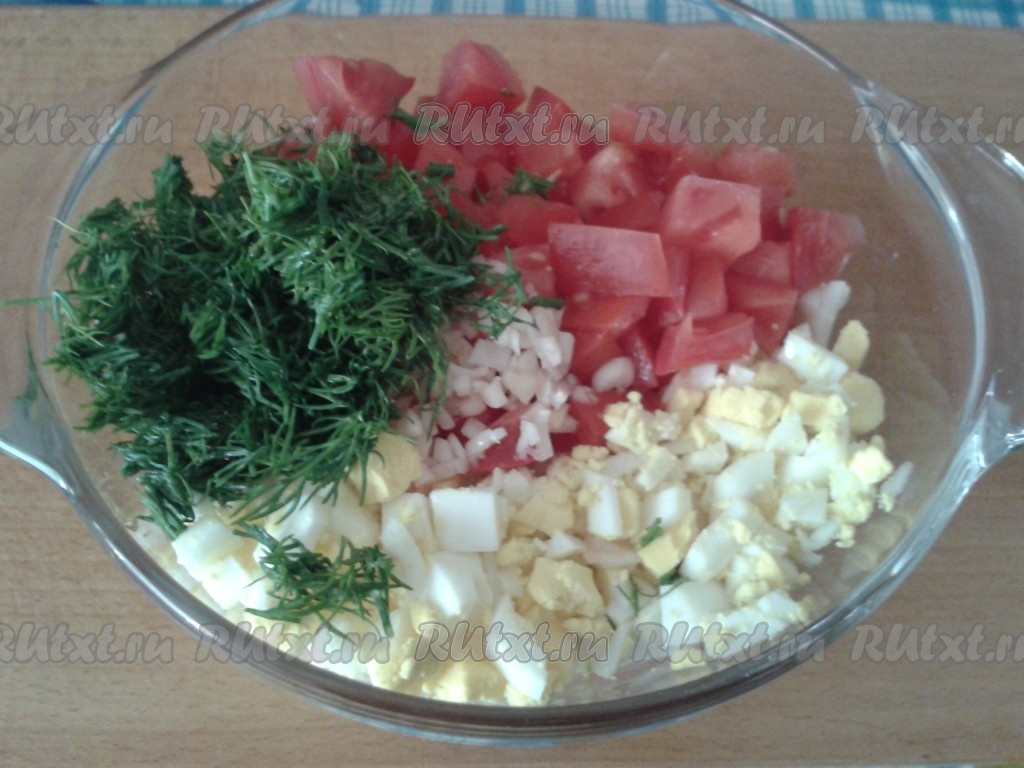 Для приготовления начинки яйца отварить и нарезать кубиками. Помидоры тоже нарезать кубиками. К помидорам добавить яйца, майонез, соль, измельченные чеснок и зелень укропа, хорошо перемешать.