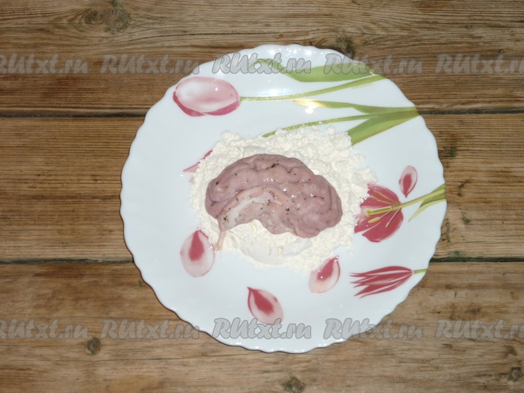 Обвалять свиные мозги со всех сторон в муке.