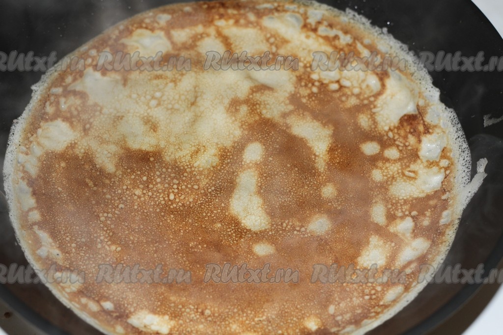 Выпекайте блинчики на тонкой сковороде с двух сторон до золотистого цвета, периодически смазывая дно сковороды растительным маслом.