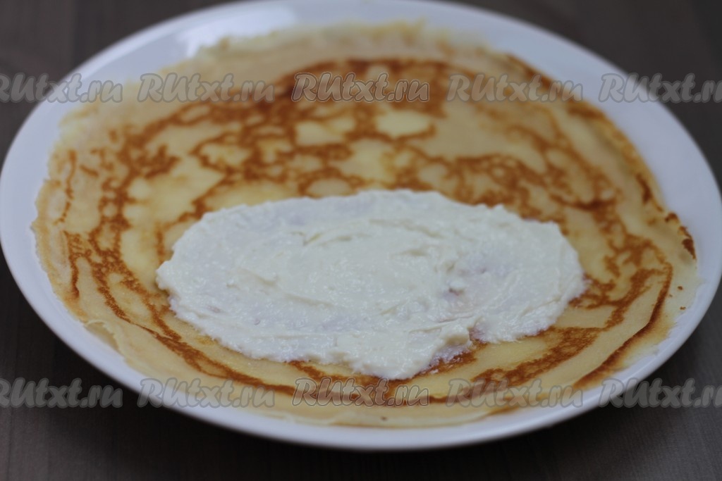 Для приготовления начинки смешайте творог, творожный сырок, сгущенное молоко, соль и сметану. Выложите творожную начинку на блин и заверните трубочкой.