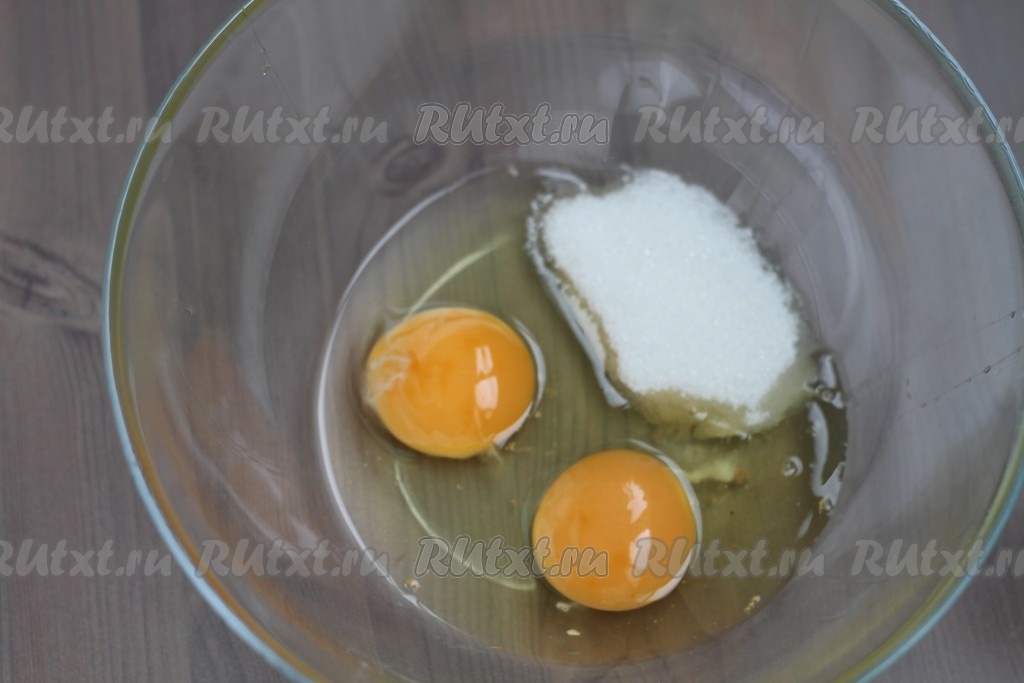 В глубокую миску разбейте яйца, добавьте сахар и соль.