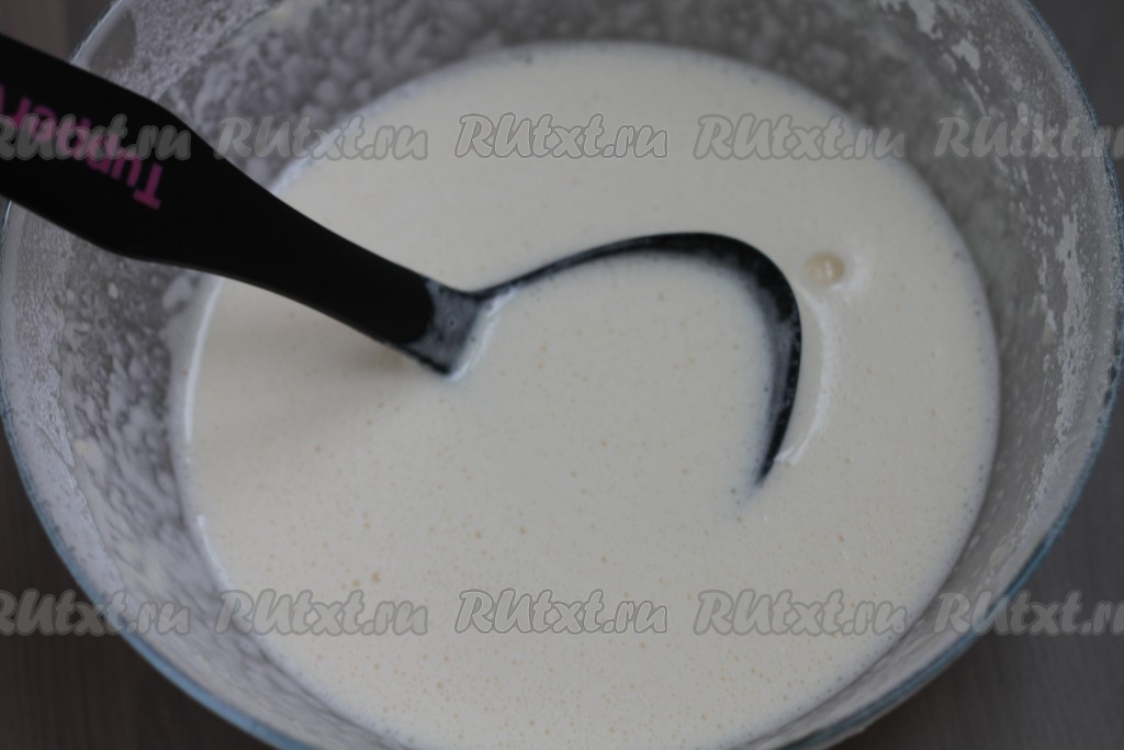 В полученную массу аккуратно влейте теплое молоко, а затем - растительное масло, тщательно перемешайте.