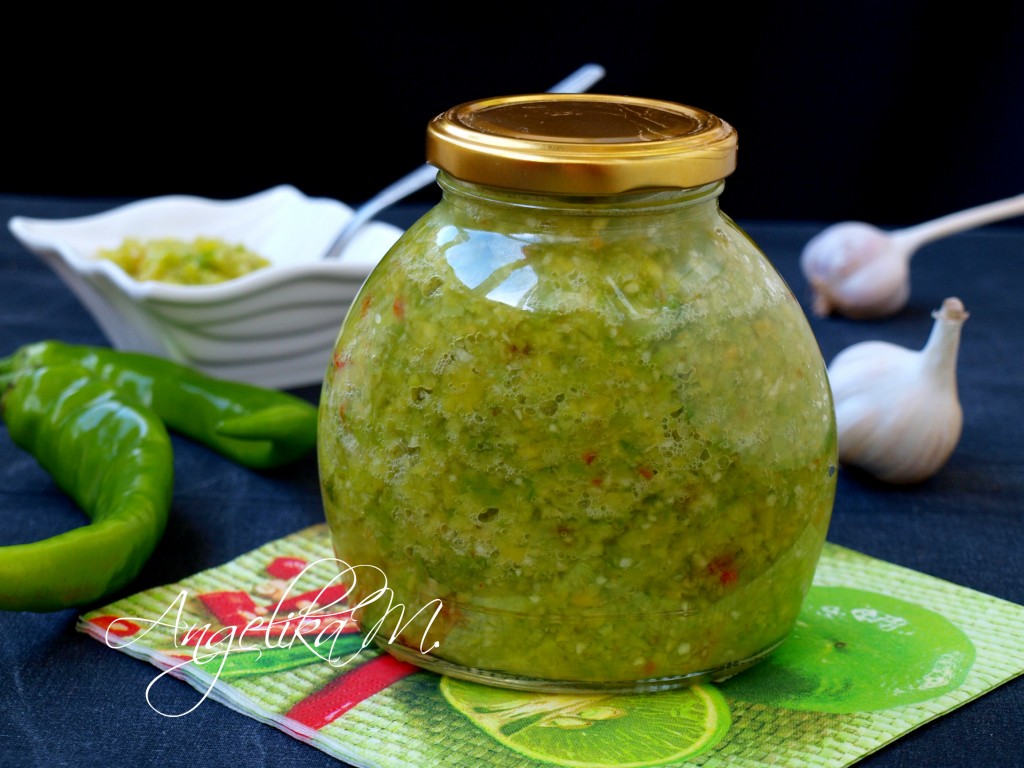 Заранее нужно прокипятить банку с крышкой, хорошо высушить. Перелить аджику в сухую банку, закрутить крышку и убрать на хранение в холодильник на самую холодную полку. Аджика из зеленого перца и чеснока может так храниться несколько месяцев.