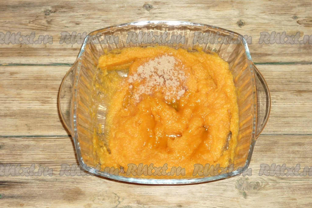 В готовое тыквенно-яблочное пюре добавить молотую корицу, сахар или сахарную пудру по вкусу (если нет противопоказаний, то лучше добавить мёд ). Всё хорошо перемешать. Если вы готовите для маленького ребёнка, то в пюре можно ничего не добавлять, так как тыква и яблоки сами по себе сладкие и ни в каких добавках не нуждаются.