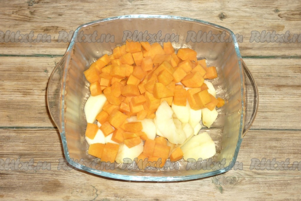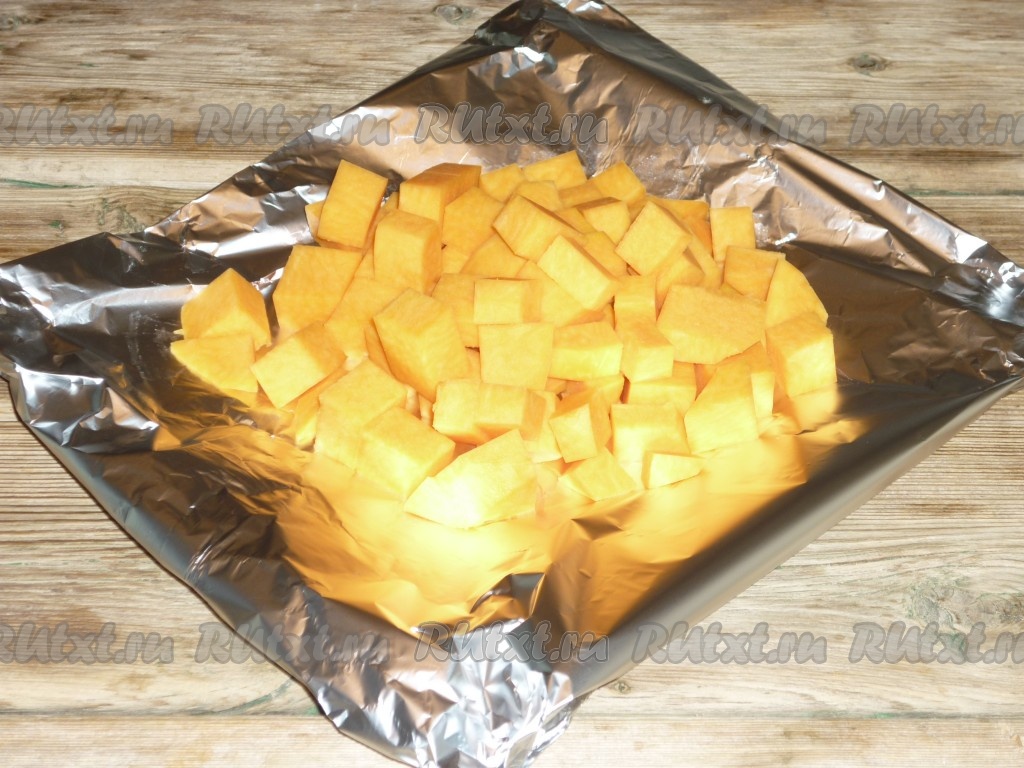 Тыкву очистить от кожуры, вымыть холодной водой и нарезать небольшими кубиками. Завернуть тыкву в фольгу для запекания.
