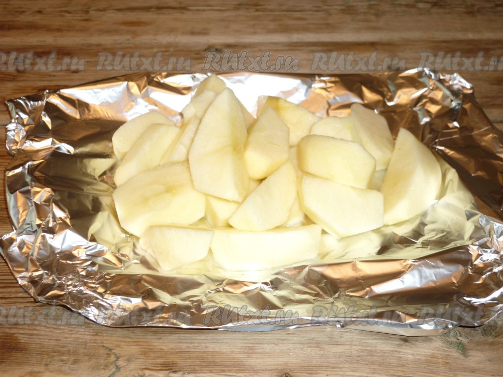 Яблоки тоже очистить от кожуры и семенной коробки, нарезать дольками и сбрызнуть лимонным соком, чтобы они не потемнели и будущее пюре было красивого, яркого цвета. Завернуть яблоки в фольгу.