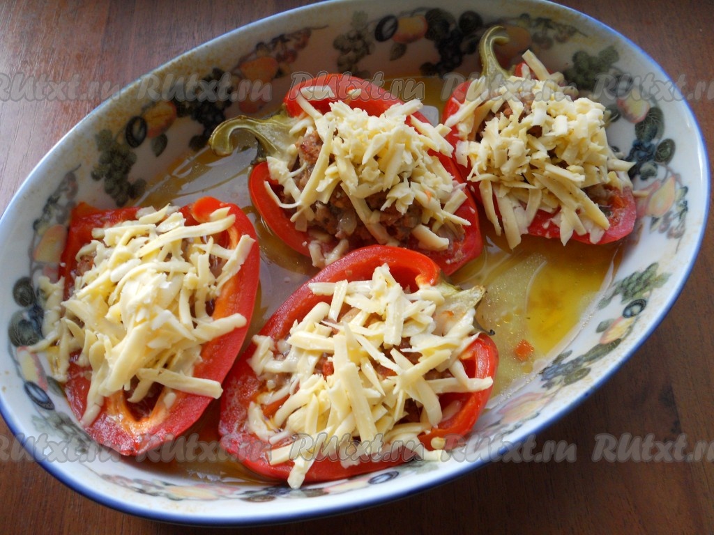 Влить в форму немного воды (50-70 мл), накрыть фольгой. Запекать фаршированные перцы в разогретой духовке при температуре 180 градусов минут 25-30, после чего форму с перцами достать из духовки, убрать фольгу. Посыпать перцы натертым сыром и снова отправить в духовку (с той же температурой) еще на 10 минут.