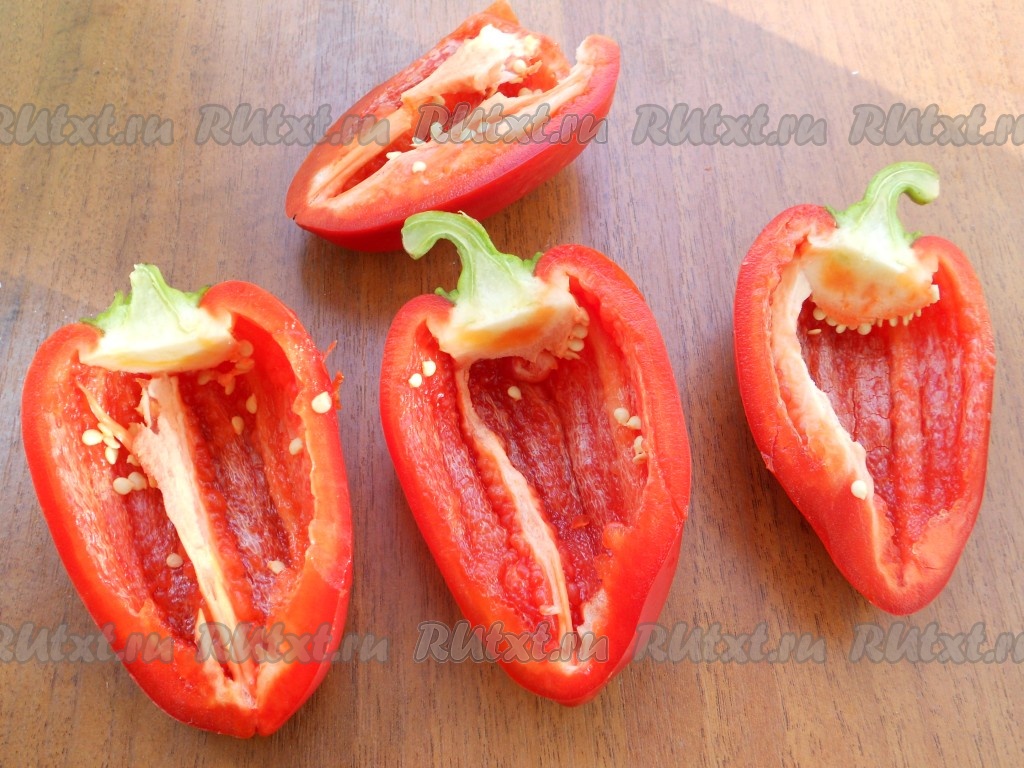Перец разрезать вдоль на 2 половины, удалить семена, хвостики оставить.