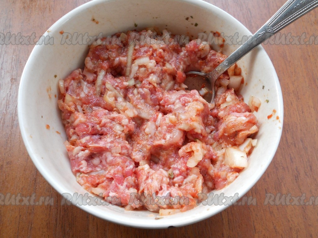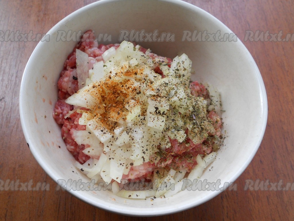 К мясному фаршу добавить мелко нарезанный репчатый лук, соль, специи, черный свежемолотый перец и паприку.