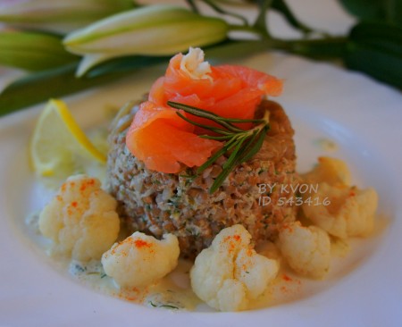 Гречку выложить на блюдо, добавить карамелизированный лук, отварную цветную капусту, тонкие кусочки слабосолёной сёмги, присыпать тёртым адыгейским сыром и паприкой. Украсить блюдо долькой лимона и веточкой розмарина. Подавать наивкуснейшую гречку и семгу с огуречно-сметанным соусом!