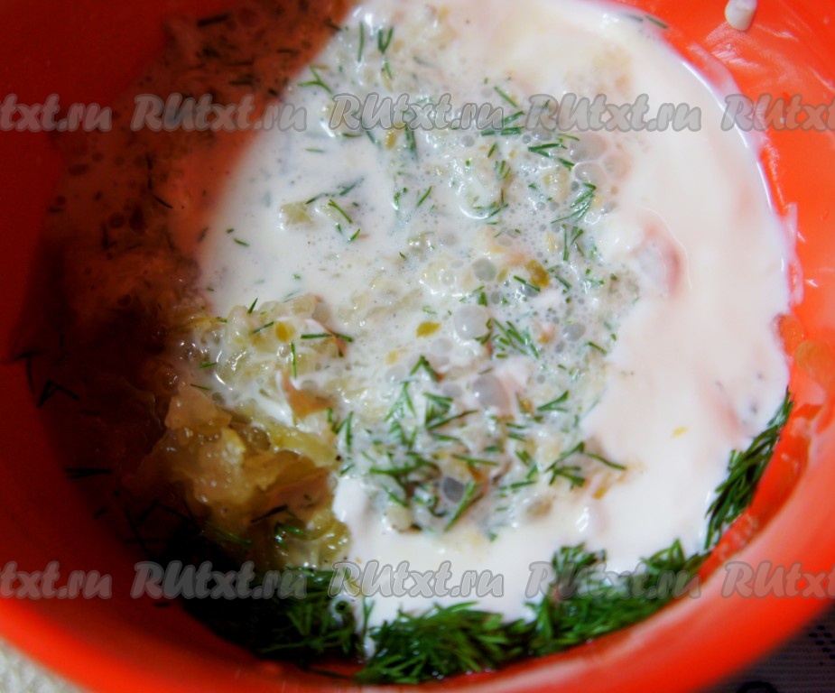 В небольшой миске смешать натёртый на тёрке солёный огурец, сметану, мелко нарезанный укроп, черный молотый перец, бальзамический уксус.