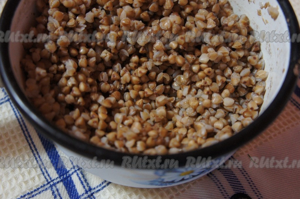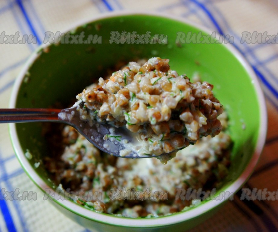 Смешать гречку с 2 столовыми ложками заправки. Перемешать.