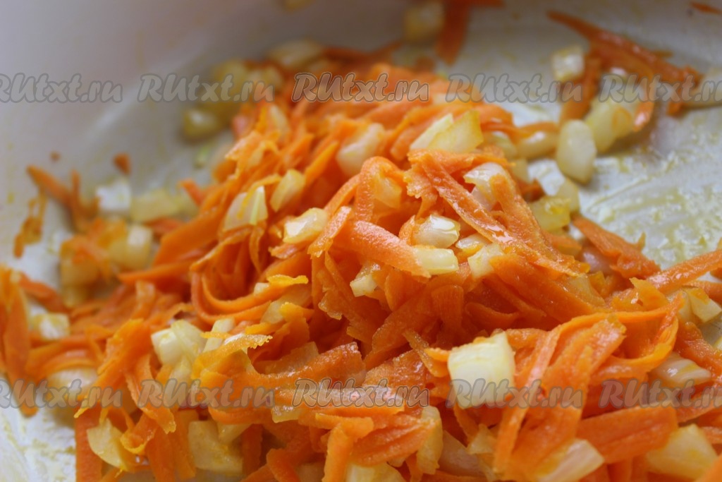 Сковороду поставить на огонь, влить немного растительного масла, выложить лук. Обжарить лук на среднем огне до состояния прозрачности, иногда помешивая. Затем в сковороду к луку добавить натертую морковь. Овощи обжарить в течение 5 минут, не забывая помешивать.