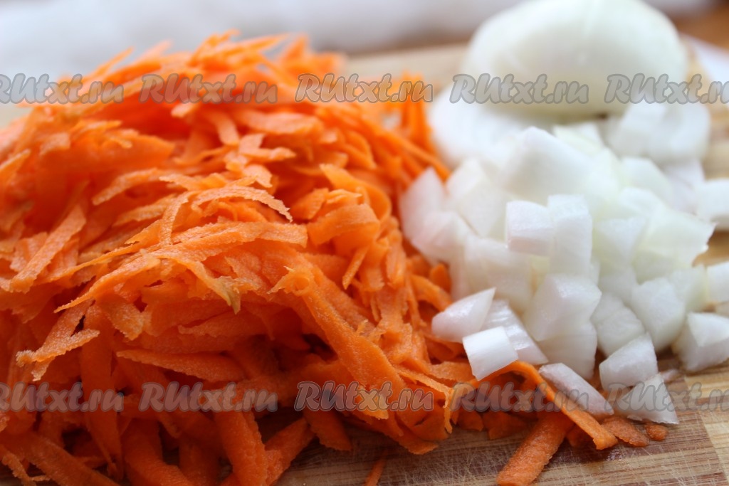 Лук вымыть, очистить и мелко нарезать. Морковь вымыть, очистить и натереть на крупной терке.