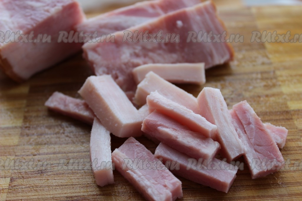 Бекон нарезать небольшими полосками или брусочками.