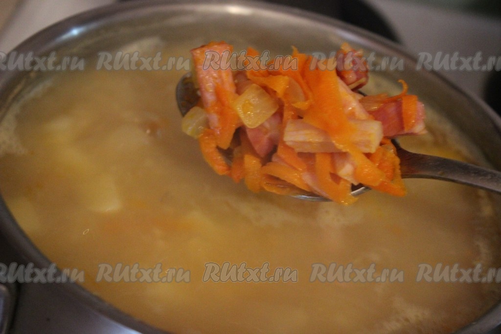 Когда картофель будет готов, добавить в кастрюлю обжаренные овощи с беконом. Затем посолить, поперчить, положить лавровый лист. Довести до кипения и варить гороховый суп на небольшом огне еще 10 минут. Затем выключить огонь, накрыть крышкой и дать настояться супу в течение 10 минут.