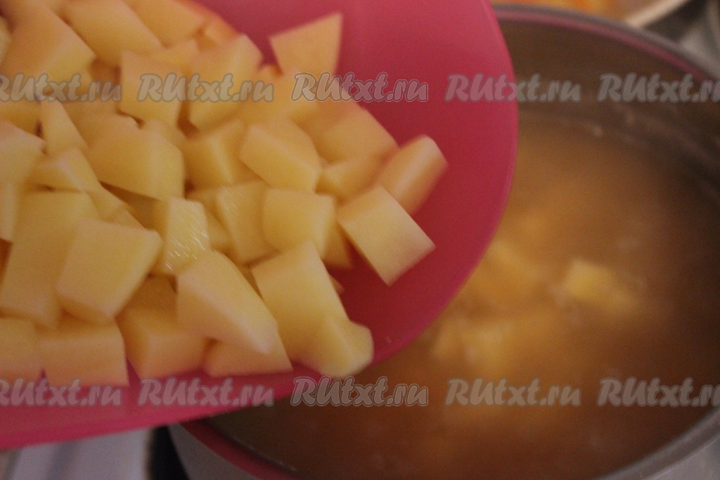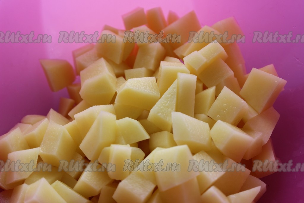 Тем временем картофель вымыть, очистить и нарезать кубиками.