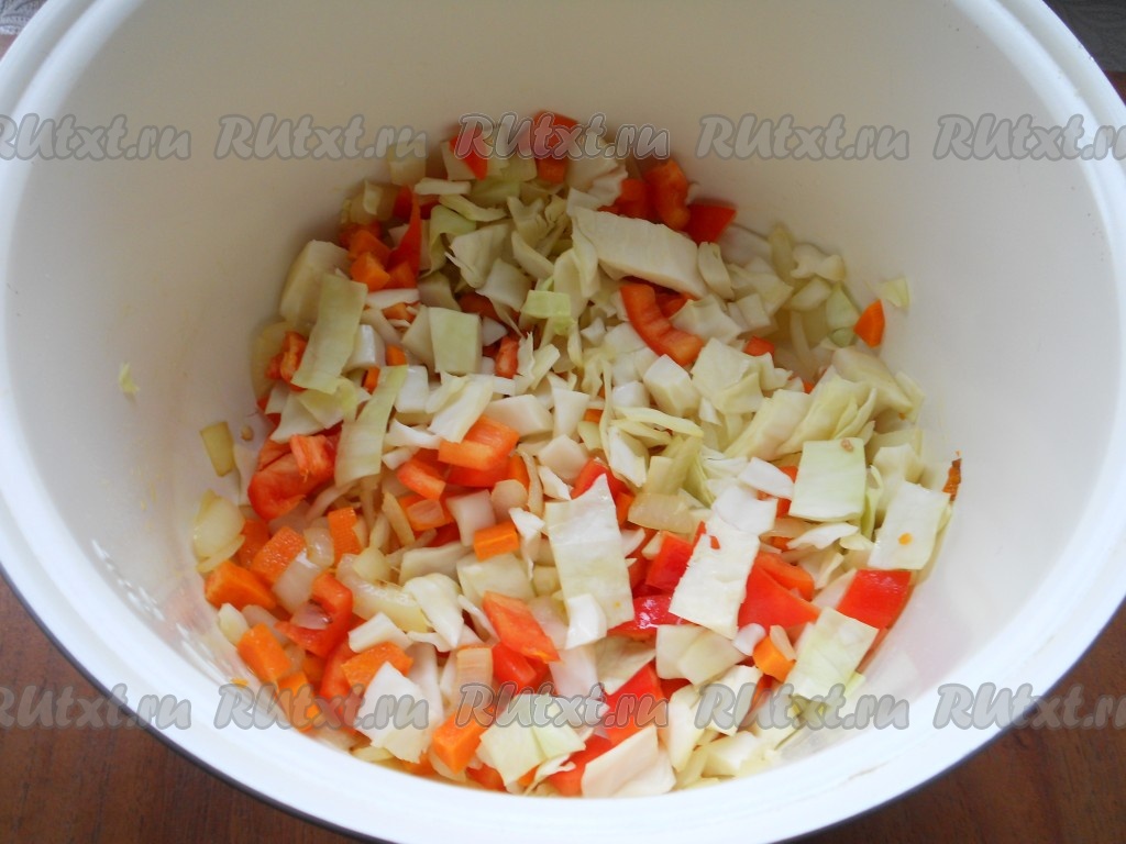 Через 10 минут после начала обжаривания лука и моркови, добавить в чашу мультиварки капусту с перцем. Готовить далее на том же режиме еще 10 минут, иногда перемешивая.