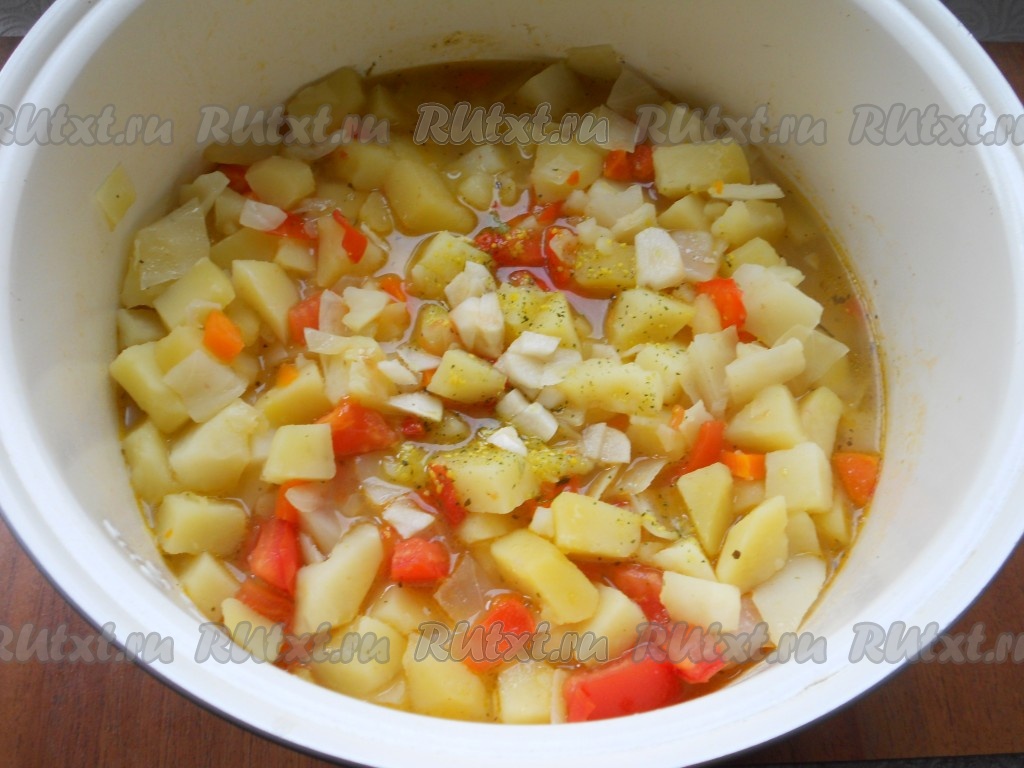 По окончании режима "Жарка" очищенный и нарезанный кубиками картофель добавить к обжаренным овощам в чашу мультиварки. Посолить, всыпать специи, добавить лавровый лист. Влить горячую воду.
