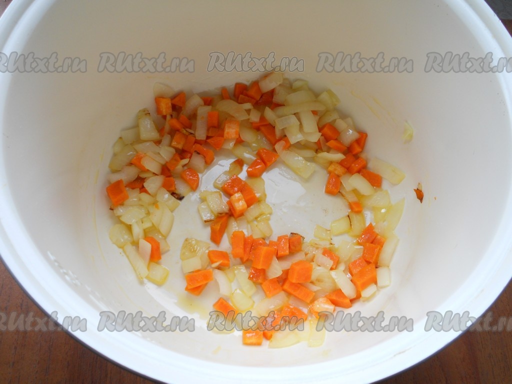 Лук репчатый и морковь очистить, нарезать небольшими кубиками. В чашу мультиварки влить растительное масло, выложить лук с морковью и выставить программу "Жарка" на 20 минут. Готовить, иногда помешивая.